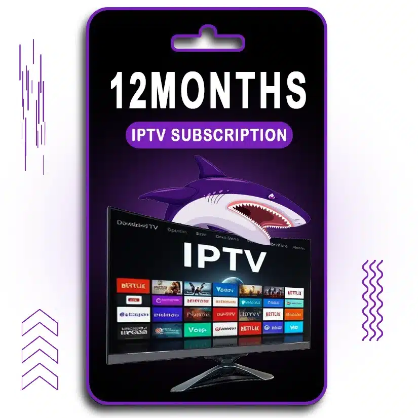 A digital card displaying "12 MONTHS IPTV SUBSCRIPTION" in bold white text on a purple background. Below, a TV screen showcases various streaming services and live TV options under the IPTV interface. A shark logo is positioned behind the screen, representing the brand. The design features a black and purple theme, with modern visual elements and a hanging card slot at the top, indicating a prepaid IPTV service valid for 12 months.